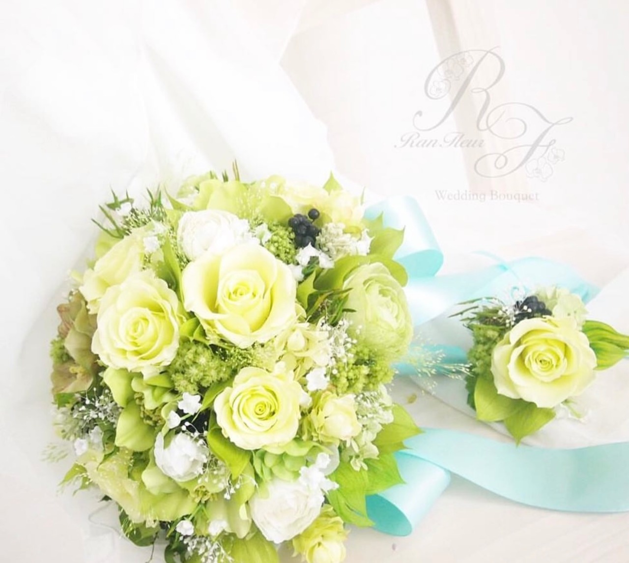 ブーケにはブートニアとブーケボックスがセットに含まれます